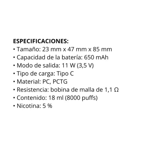 Hasta 8000 caladas en un solo equipo, con flujo uniforme y respuesta inmediata. La pantalla integrada permite visualizar batería y uso, evitando interrupciones inesperadas. Pensado para un uso continuo, sin pérdidas de sabor ni caída de rendimiento.